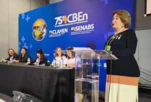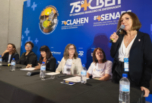 A presidenta da ABEn, Jacinta Senna, fez uma fala especialmente construída para este momento histórico. Um discurso firme, sensível e político, que reafirmou a missão centenária da entidade: