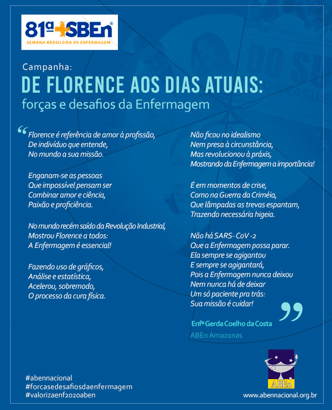 Campanha | DE FLORENCE AOS DIAS ATUAIS: forças e desafios da Enfermagem. 8 de maio de 2020 admin Post in Notícias ABEn Amazonas. Autora: Enfª. Gerda Coelho da Costa.