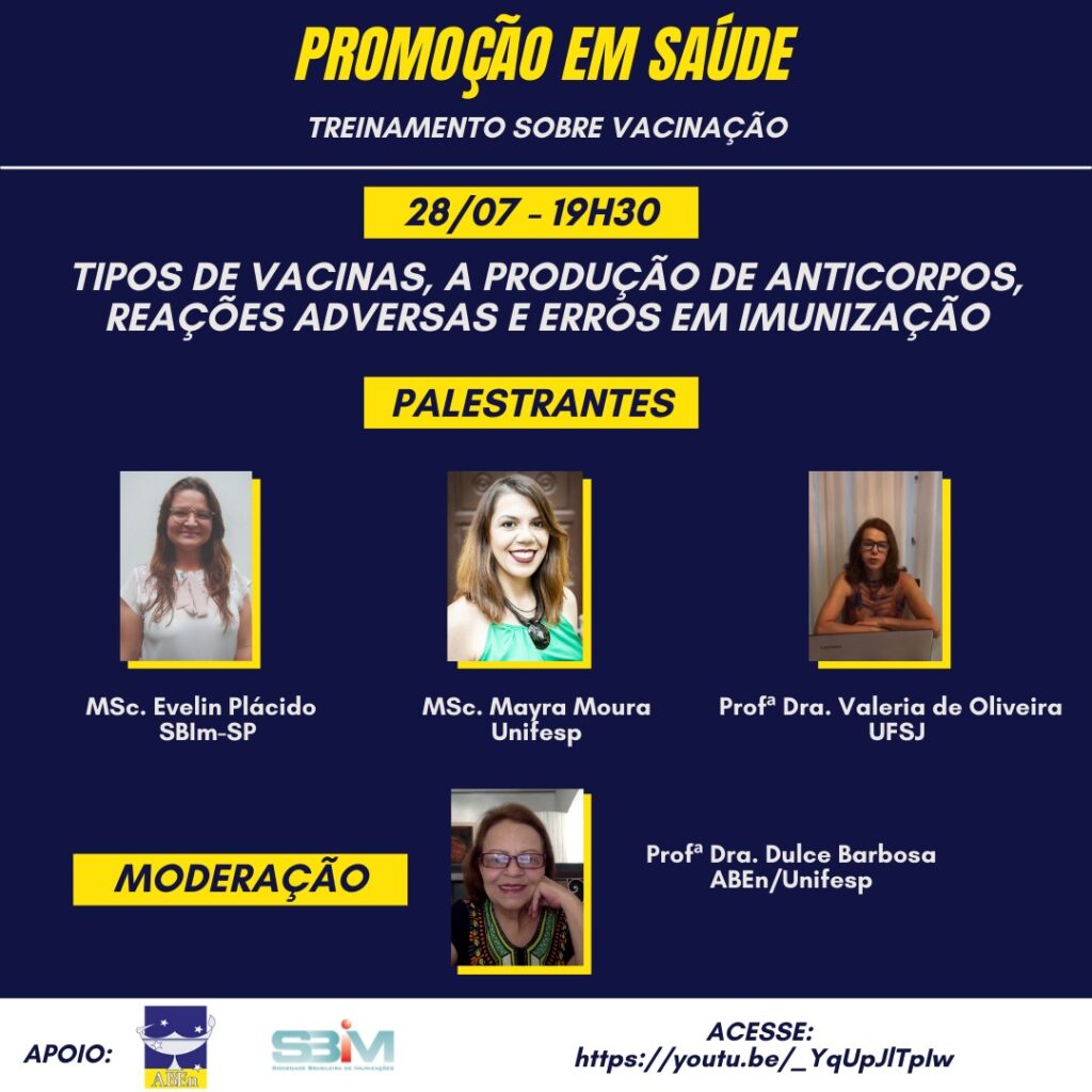 Tipos de vacinas, a produção de anticorpos, reações adversas e erros em imunização. 26 de julho de 2021 admin Post in Notícias Treinamento sobre Vacinação. Data: 28/07 às 19h30.