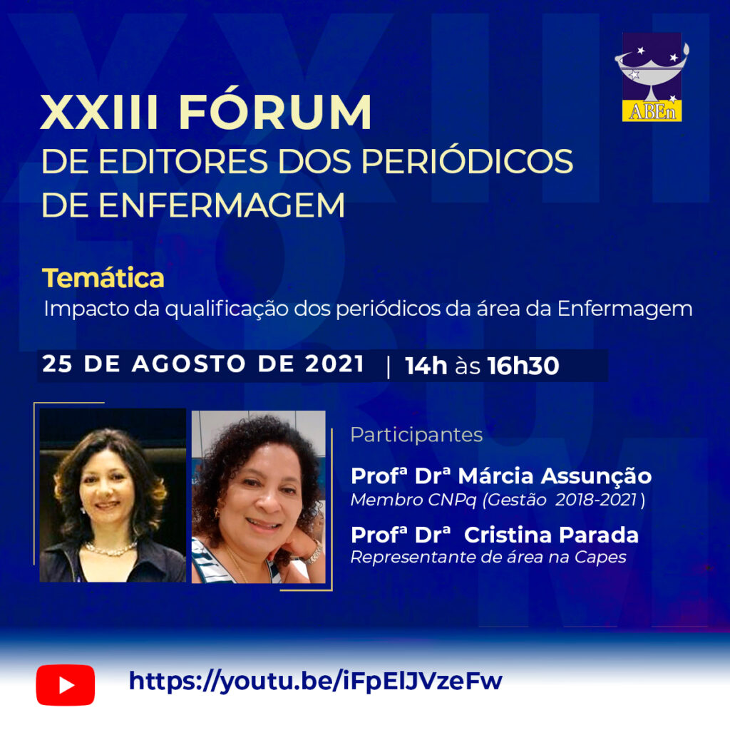 XXIII Fórum de Editores dos Periódicos de Enfermagem. 27 de agosto de 2021 admin Post in Notícias Acesse a Live: https://youtu.be/iFpElJVzeFw