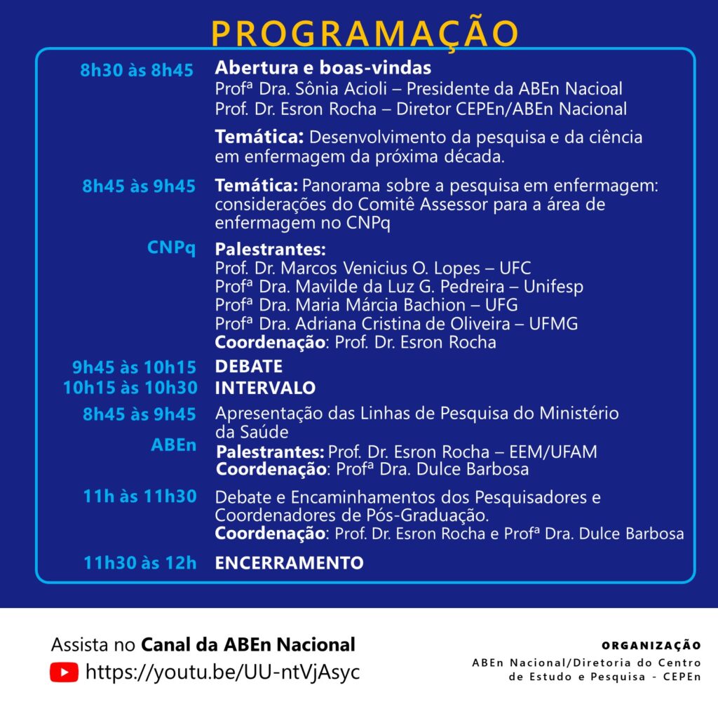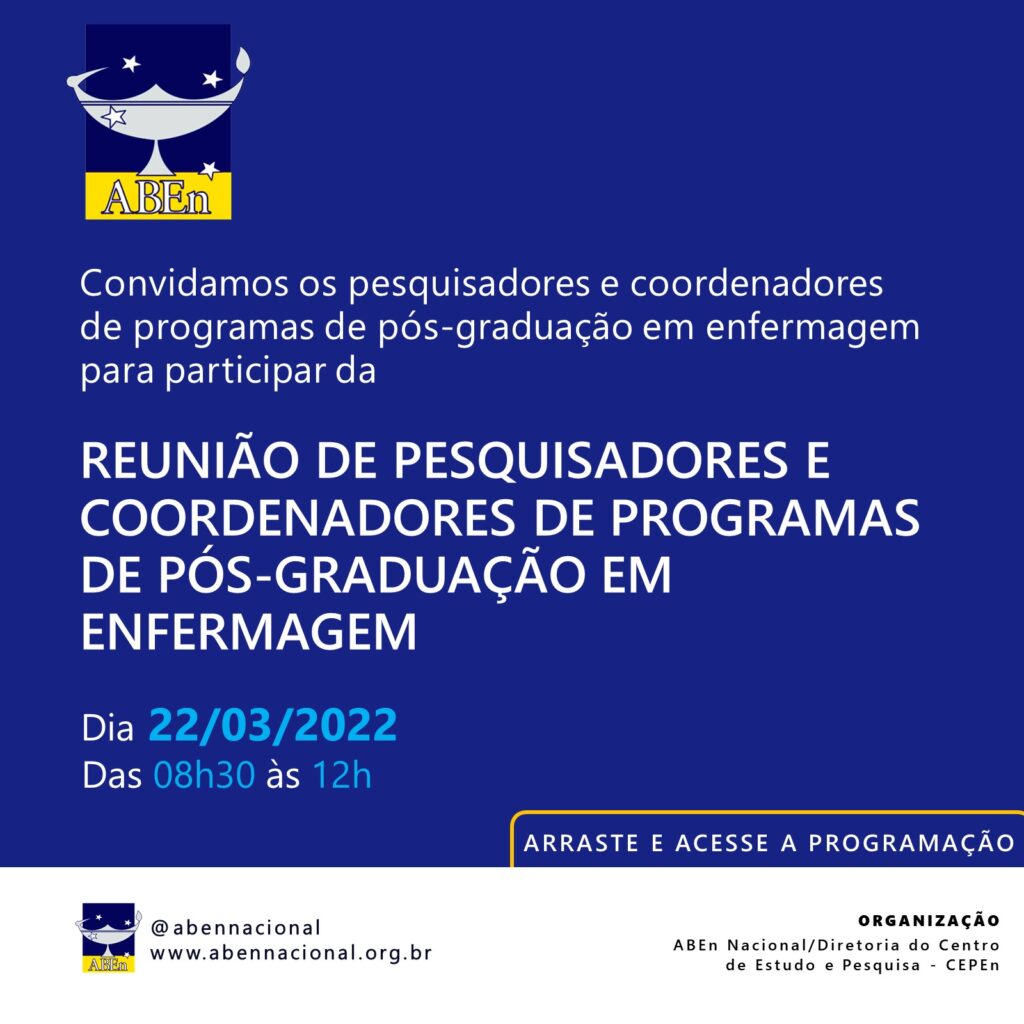 Convidamos os pesquisadores e coordenadores de programas de pós-graduação em enfermagem para participar da REUNIÃO DE PESQUISADORES E COORDENADORES DE PROGRAMAS DE PÓS-GRADUAÇÃO EM ENFERMAGEM.