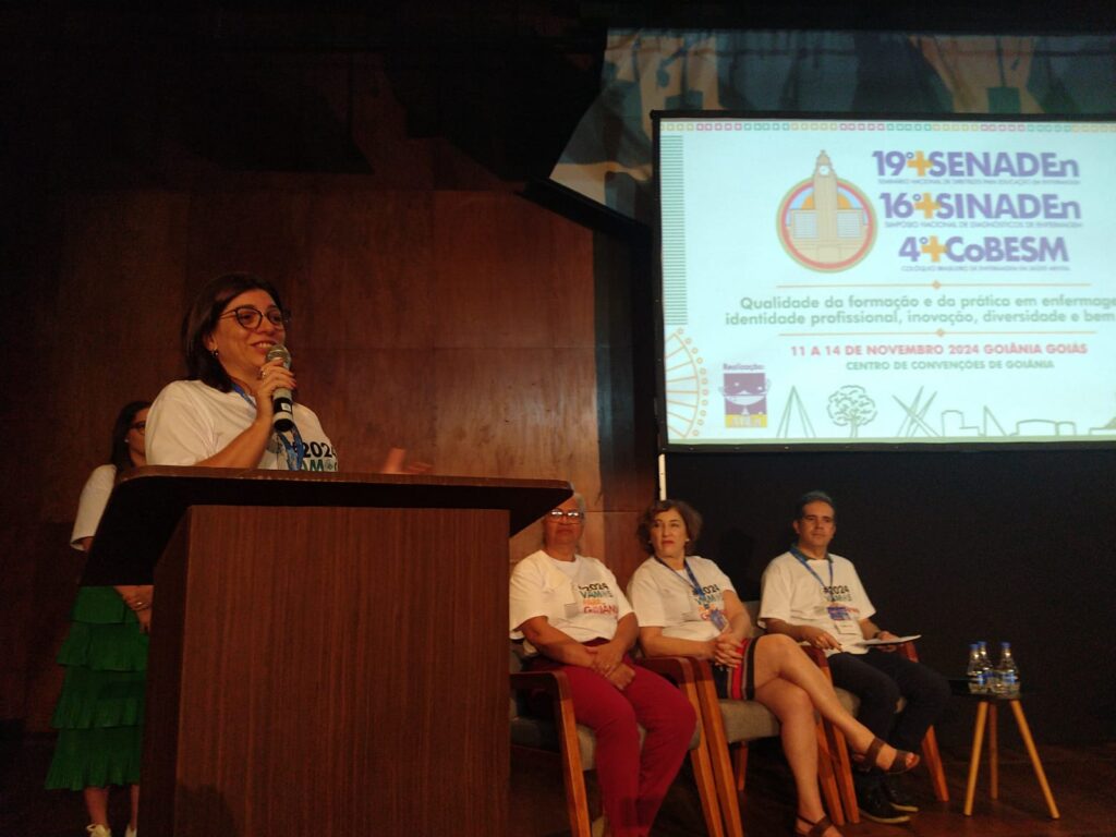 Participaram do lançamento do 19º SENADEn, 16º SINADEn e 4ºCoBESM a presidenta da ABEn, Jacinta Sena, a diretora de Educação em Enfermagem, Celia Alves Rozendo, e a diretora do Centro de Desenvolvimento da Prática Profissional e do Trabalho de Enfermagem, Lívia Angeli Silva. “Esses são importantes momentos para ampliar e fortalecer os temas fundamentais, desta vez, vamos inovar trazendo o colóquio sobre saúde mental, assunto que perpassa os demais temas. Aqui no 74º CBEn temos a oportunidade para iniciar o processo de divulgação e mobilização para nosso SENADEn, SINADEn e COBESM”, afirmou a presidenta.